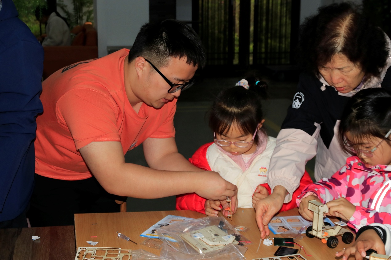 活动现场,志愿者化身“科学小导师”,通过两大核心实验点燃孩子们的探索热情。在静电气球实验环节,志愿者将气球反复摩擦后,纸屑瞬间吸附其上。“原来摩擦会产生静电!” 孩子们争相体验,在亲手操作中解锁物理现象的神奇密码。而太阳能小车组装环节更将活动推向高潮,志愿者细致讲解光能转化原理后,指导孩子们亲手组装小车,感受光能转换为电能,再驱动小车前行的神奇过程,让他们在实践中理解新能源的魅力。