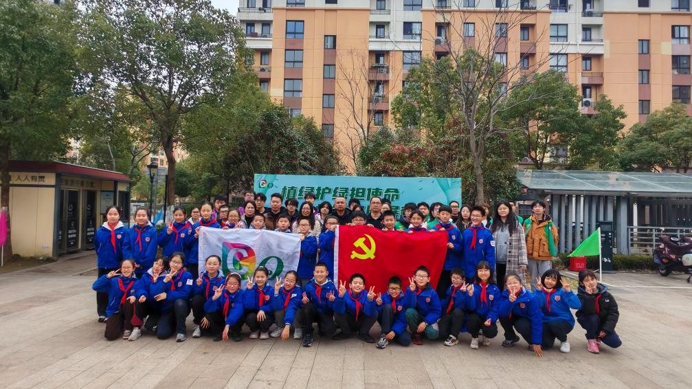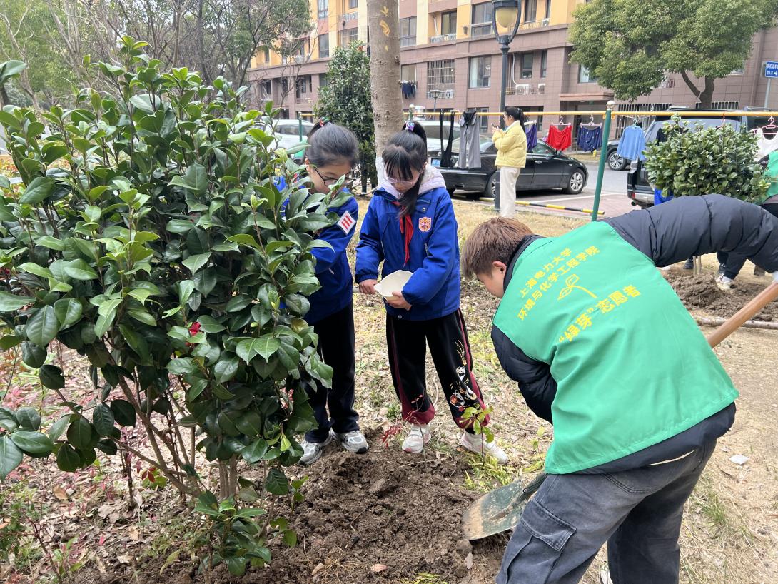 活动当日,学院志愿者身着统一绿色马甲,活跃在活动现场。大学生们与社区居民、小学生分组协作,共同种下20余棵适宜临港地区生长的桂花、山茶花等树苗。在种植过程中,志愿者们凭借专业知识,向小学生详细讲解植树要点及生态环保意义,并将专业知识转化为通俗易懂、居民可操作的环保方案,让环保理念深入人心。种植结束后,同学们悬挂精心制作的 “成长纪念牌”,见证青少年的绿色承诺,也为社区增添一片新绿,打造出“社区共建林”这一绿色空间,促进社区生态环境的改善。
