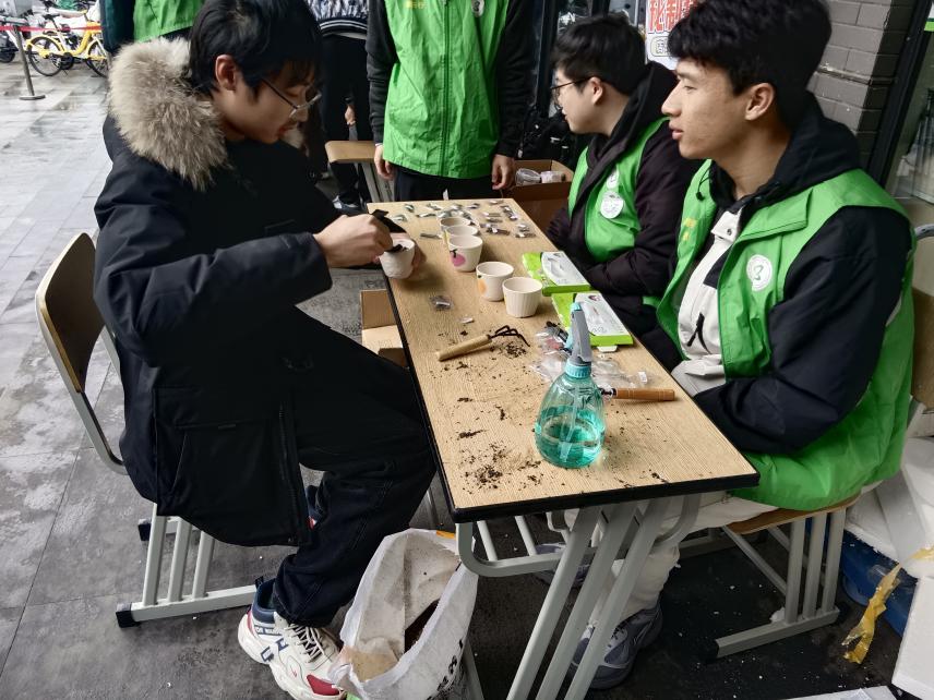 校内“种下心意,带走葱绿”种植区成为活动热点。我院团委别出心裁地设计了“碳中和主题花盆”,采用废弃陶瓷碎片与生物降解材料制成,既环保又具创意。活动共发放 300 余个环保花盆、500 份种子礼包。学生们在花盆上写下环保承诺,如 2022 级本科生薛亚楠所写:“愿我的小薄荷为教室添一缕绿,更愿我能为地球减一份碳。”这一活动不仅为校园营造了独特的微生态景观,也让学生们将绿色理念带回家,随时随地参与到绿色生活的实践中,打造出属于自己的“校园微生态”记忆。