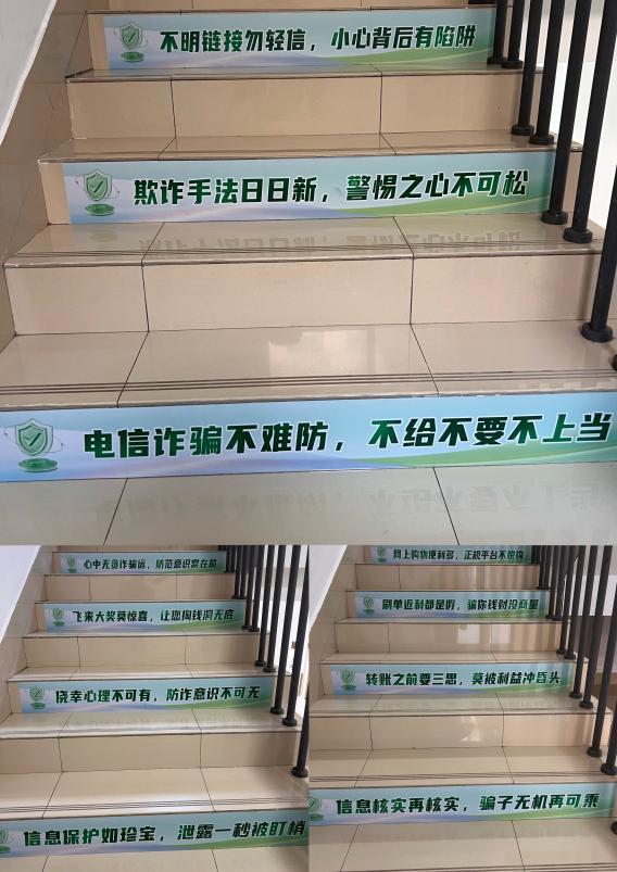 学院积极营造浓厚的反诈宣传氛围,力求做到“抬头可见、驻足即学”。在学院楼门前的主干道上,悬挂着醒目的反诈标语横幅,“未知链接不点击、陌生来电不轻信、个人信息不透露、转账汇款多核实” 等朗朗上口的提示语,时刻提醒着过往学生提高警惕。同时,学院创新性地在楼内楼梯台阶张贴 “防诈阶梯”警示地贴,诸如“信息核实再核实,骗子无机再可乘”“侥幸心理不可有,防诈意识不可无” 等标语,让学生在日常行走间潜移默化地接受反诈教育。此外,学院充分利用新媒体平台的传播优势,在微信公众号上连续推出《诈骗套路多 防诈有妙招》专题内容,各班级群也定期转发警方发布的预警信息,确保反诈宣传全方位、无死角,真正深入到学生的学习与生活之中。