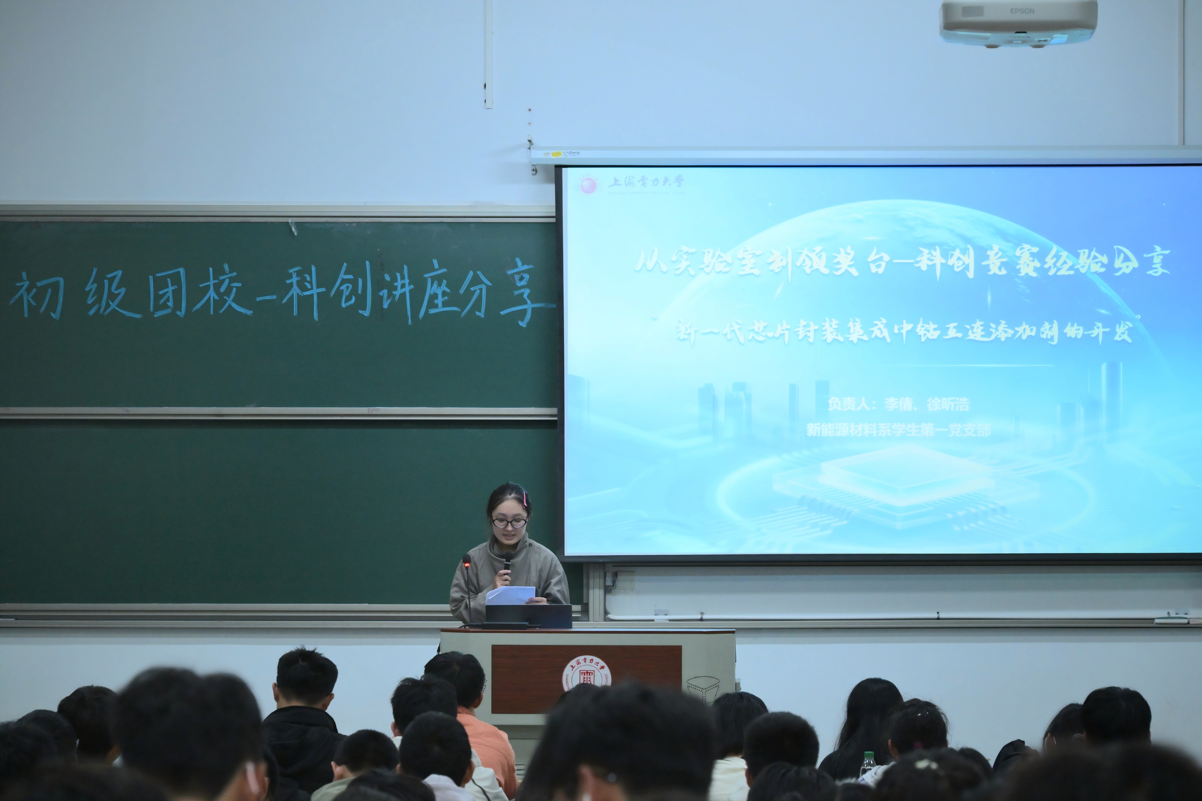 10月20日晚,新能源材料系学生第一党支部品牌活动“科研充电桩”走进初级团校,进行科研科创经验分享。本次活动以“从实验室到领奖台——新一代芯片封装集成中钴互连添加剂的开发”为主题,聚焦科研成果转化,旨在提升学生科创竞赛实践能力。活动在临港校区三教106举办,由支部党员、2023级硕士研究生李倩主讲,本期初级团校全体同学出席。