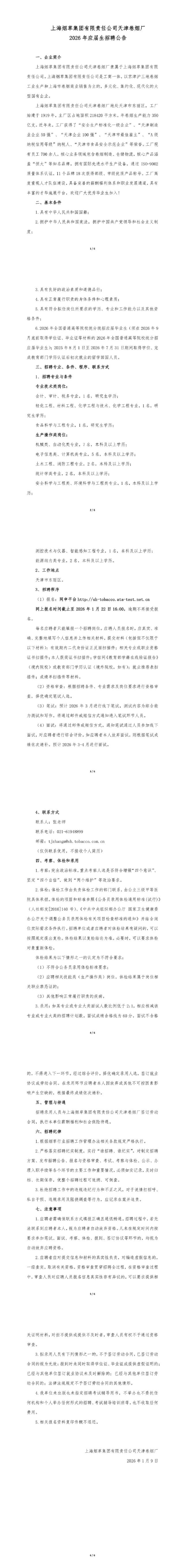 院2026届就业信息【68】——上海烟草集团有限责任公司天津卷烟厂