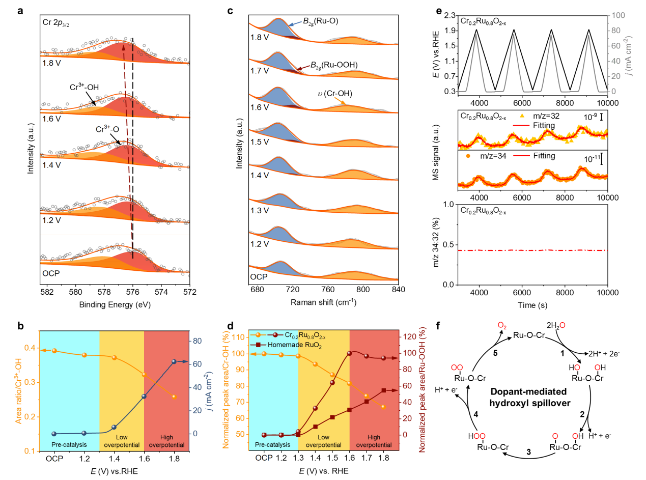 一系列原位测试和DFT理论计算表明,铬掺杂和氧空位共同诱导产生了一种非常规的OER机制——掺杂位点介导羟基溢流反应机制(Dopant-mediated hydroxyl spillover mechanism)。在反应过程中,Cr作为Lewis酸性位点可以从水中连续捕获羟基物种并溢流至Ru活性位点,将反应的决速步骤由常规吸附质演化机制(AEM)的OOH*生成转变为O2生成,大幅降低了反应能垒,在不牺牲稳定性的条件下显著提高了催化活性。同时,Cr作为可变价态元素,可以在反应中向Ru动态提供电子,抑制了活性位点的过度氧化溶出,进一步提高了催化稳定性。