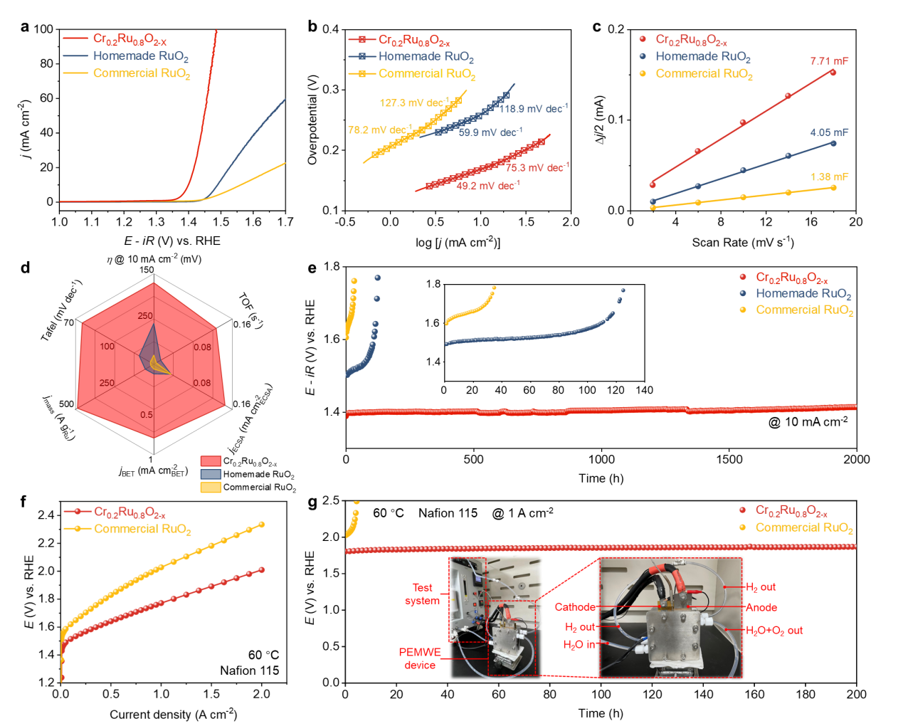 鉴于此,研究人员报道了一种含氧空位的铬掺杂二氧化钌催化剂(Cr0.2Ru0.8O2-x),其在酸性介质中表现出优异的OER性能:达到10 mA cm-2的电流密度仅需170 mV过电位,并稳定运行2000小时以上。进一步将其装配至实际PEM电解池的阳极,达到1 A cm-2的电流密度仅需1.77 V槽压,并稳定运行200小时以上。