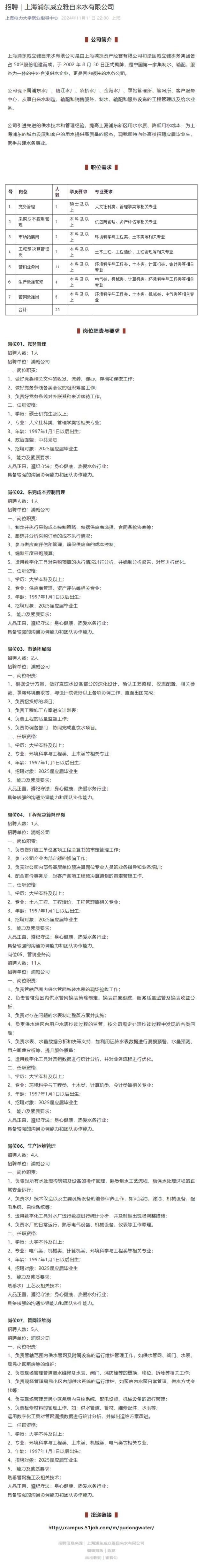 院2025届就业信息【47】——上海浦东威立雅自来水有限公司